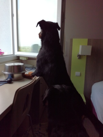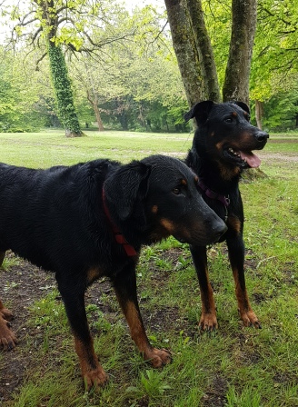 Nous emmenons Iro et Izel sur le site pour qu'ils prennent un peu l'ambiance... Je pensais passer Iro à la morphologie samedi en pensant qu'il serait plus calme. Fred le tenait et je tenais Izel. Iro semblait un peu énervé et Izel plutôt calme.